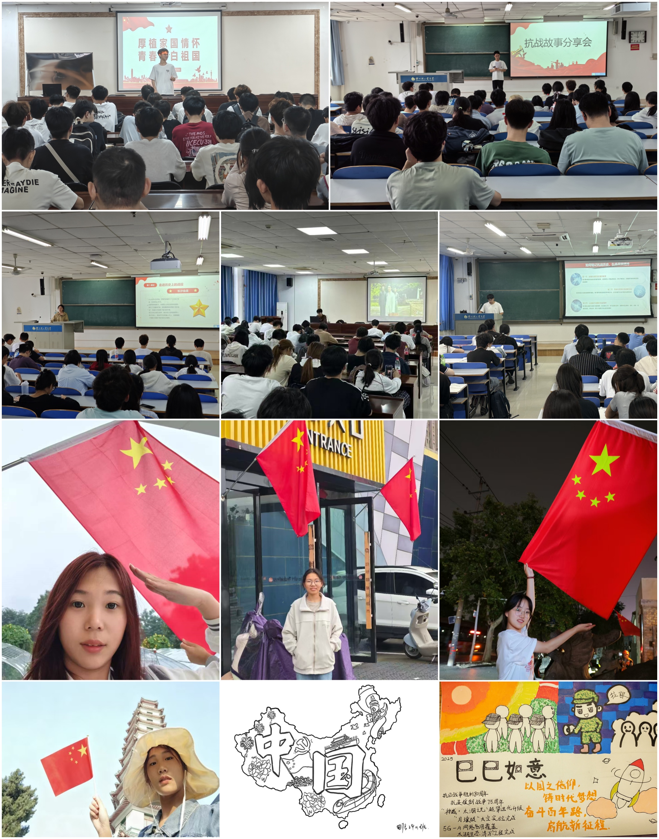 活动中,各团支部通过专题团课、故事分享、爱国观影等形式,深入学习了党史、新中国史、改革开放史、社会主义发展史、中华民族发展史,在交流分享环节同学们踊跃讲述爱国先辈与身边榜样事迹,厚植红色基因和家国情怀;集中观看了《长津湖》《建国大业》等爱国影片,让同学们在光影中感悟革命先辈的英勇担当。此外,同学们还积极参与“我与国旗合个影”“国庆主题书画作品征集”等主题活动,同学们手持国旗以最真挚的情感与国旗同框,定格下一幕幕温馨而动人的瞬间;书画作品用笔墨描绘着祖国的壮丽山河,展现了同学们对祖国生日的深切祝福,以实际行动传递爱国情怀。