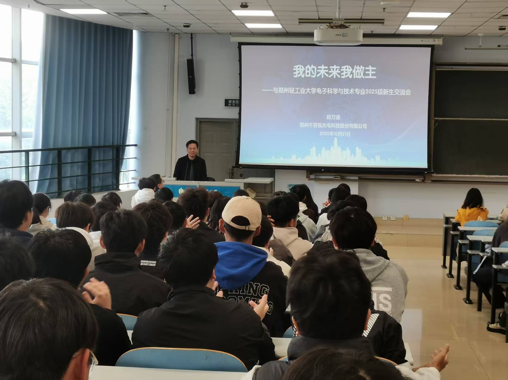 为帮助学生全面筑牢专业认知,精准明晰未来方向,营造浓厚的学习氛围,10月21日,网络赌博 在东风校区举行电子科学与技术专业导论暨新生入学教育大会。本次大会邀请郑州千百视光电科技股份有限公司段万通董事长主讲,电子科学与技术系主任张志峰、副主任杨红军及2025级电子科学与技术专业全体学生参加。