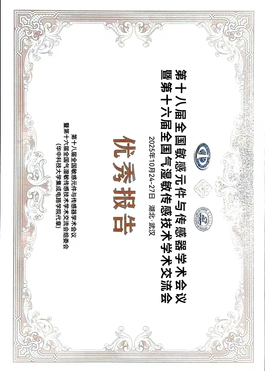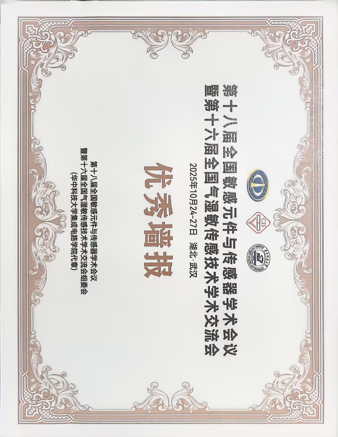 本次会议由中国仪器仪表学会传感器分会、中国电子学会传感与微系统技术分会联合主办,华中科技大学、湖北江城实验室等单位承办,吸引了来自全国高校、科研院所和企业的专家学者,包括院士﹑国家杰青、国家优青等高层次人才1000余名。大会设置了13个专题分会报告,涵盖新型传感器与智能传感技术、气湿敏材料表界面调控与应用、半导体传感器芯片与MEMS集成等领域。在分会报告环节,张永辉教授做了题为“二维半导体材料的精准构筑及传感性能研究”的邀请报告,系统展示了团队在二维材料可控制备及气体传感性能研究方面的创新突破;田宽老师分享了“利用GC-MS研究金属氧化物气敏反应机理的方法探索”的报告,荣获“优秀报告奖”;王伶俐老师分享了题为“基于FeCl₃改性的MIL-101(Cr)高灵敏度湿度传感器”的创新研究成果,荣获“优秀墙报奖”。这些成绩充分体现了我校在传感材料与器件方向的科研实力,更展现了学校学科交叉融合与实践育人的显著成效。