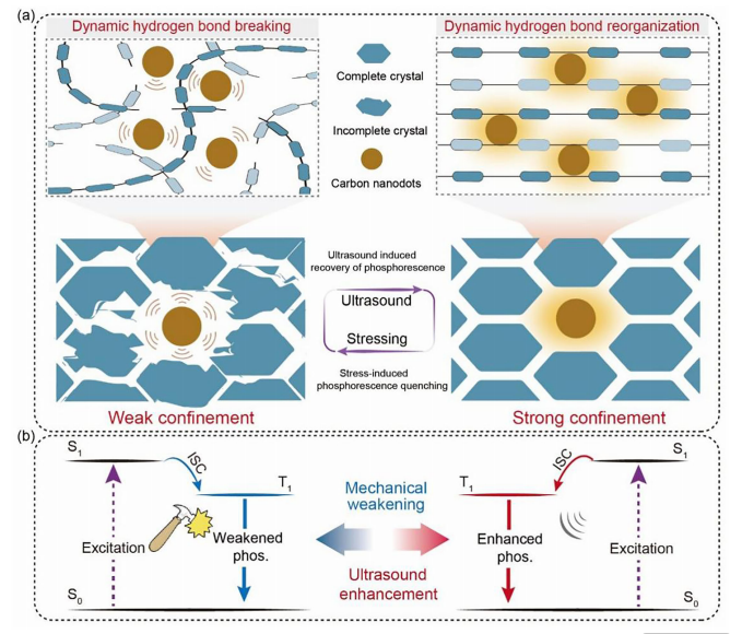 具有机械应力响应特性的固态磷光材料已被广泛开发用于多种应用。然而,由于三重态激子的超快失活以及刺激位点的调节困难,在极端条件下如何实现可逆调控的三重态激子仍未实现。此外,大多数现有材料无法实现集成记忆与可逆功能为一体,这就进一步限制了其应用。郑州轻工业大学梁亚川团队提出了一种氢键诱导的超分子限域工程策略,利用环糊精捕获碳纳米点(CNDs),并实现具有可逆且记忆良好的机械响应室温磷光(RTP)。使用机械应力破坏亚稳态氢键网络,通过增强三重态激子的非辐射跃迁来削弱磷光。值得注意的是,该策略可以通过对刚性环糊精基质的超声重建来恢复RTP强度。在航空航天结构应力监测中,嵌入的CNDs薄膜可以实现机翼在突发受力事件下应力分布可视化。该工作建立了适用于极端航空航天环境的无损监测。