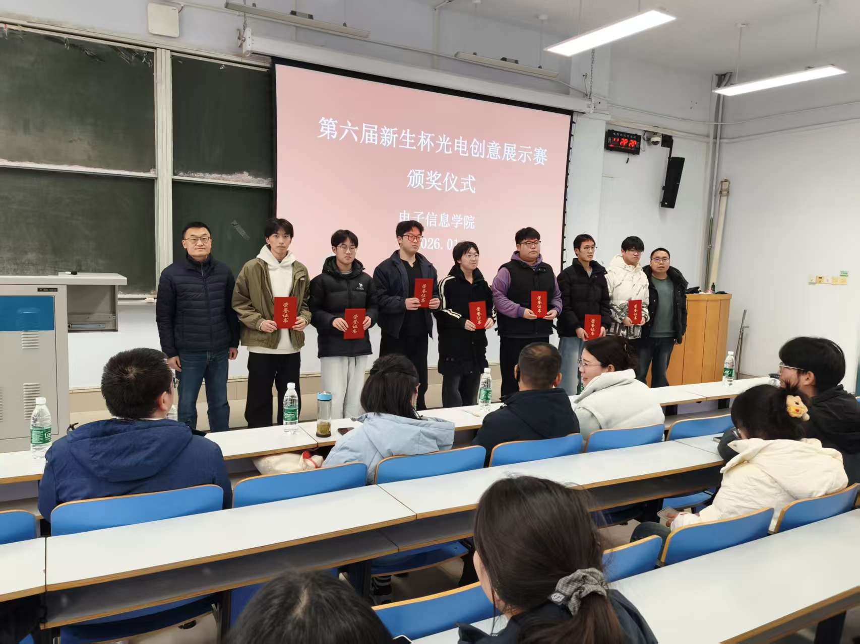 2026年1月4日,网络赌博 第六届新生杯光电创意展示赛结项汇报和颁奖仪式在东风校区举行。电子科学与技术系主任张志峰,副主任杨红军,四位班级班主任李森、刘素娟、王东琳、赵雪冬老师以及2025级电子科学与技术专业全体新生参加了汇报和仪式。
